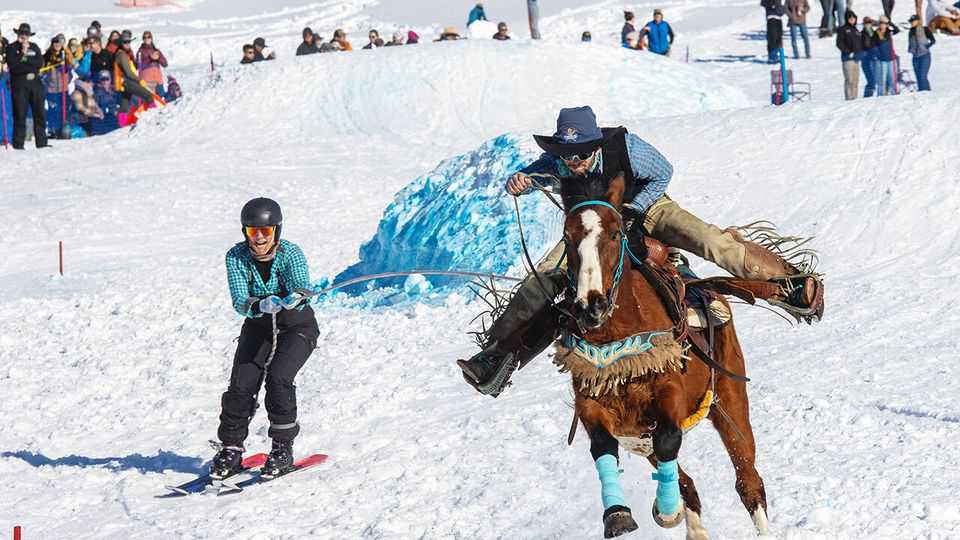 赛场氛围混杂着马粪味、奶牛铃铛声和狂热的叫喊。观众们即便不是牛仔或滑雪发烧友,也能从诸如“干草五十度灰”(50 Shades of Hay)或“两个笨蛋加一根绳子”(Two Idiots and a Rope)这种充满西部幽默的参赛队名中,感受到这项运动那股原始、硬核且充满野性的魅力。