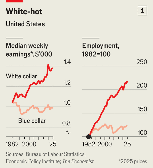 自 2022 年底以来,美国白领岗位不仅没有崩溃,反而增加了约 300 万个。软件开发人员、放射科医生和律师助理等曾被视为 AI“早期受害者”的职业,其就业人数均显著增长。与此同时,白领薪资也在持续上升,且相对于蓝领的薪资溢价依然保持在高位。