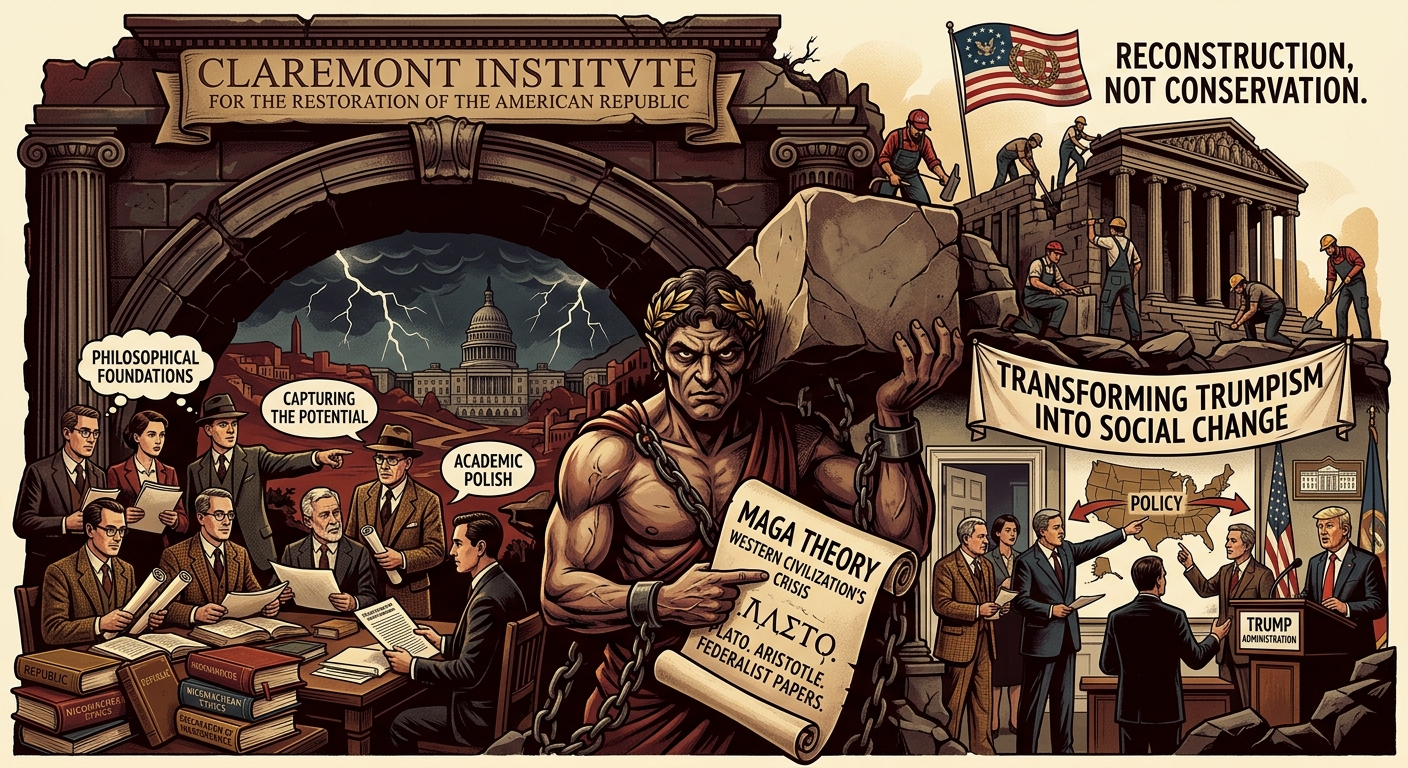 克莱蒙思想的核心在于“危机感”:他们认为美国在进步时代偏离了建国原则,官僚机构和福利制度已背离“被统治者的同意”。与主张维持现状的传统保守派不同,克莱蒙人认为现有体制已腐朽,不再值得守护。这种心态使他们从“保守”转向了“反革命”。